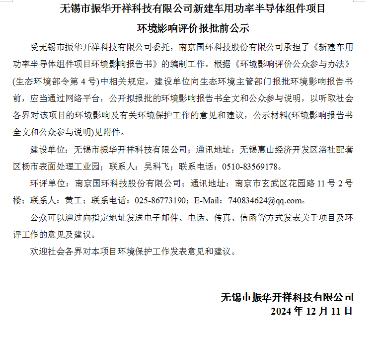 受無錫市振華開祥科技有限公司委托,南京國環(huán)科技股份有限公司承擔了《新建車用功率半導(dǎo)體組件項目環(huán)境影響報告書》的編制工作。根據(jù)《環(huán)境影響評價公眾參與辦…
